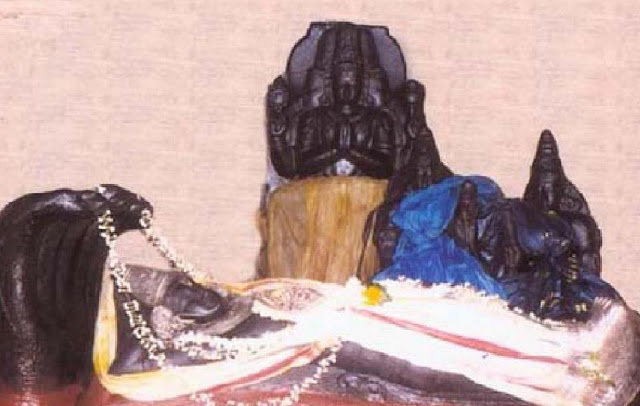 Shiva ordered sage Vyakrapada to perform penance at Srirangam requesting the god Vishnu to give him place in his abode Vaikunta. Vyakrapada was joined by sage Patanjali in his journey. Because of his poor eyesight, the sages instead went southward, lost their way and reached Krupa Samudram, modern day Tirusirupuliyur. They prayed to Vishnu to come to Srirangam to grant them moksha(divine attainment). It is believed that Vishnu originally gave darshan (appeared) to the sages as Ranganatha, the form worshipped in the Srirangam temple. Because of their old age, the sages could not see the big image of Vishnu clearly and hence he appeared in a smaller form known as Bala Sayanam (smaller recline), the sleeping posture of a small kid. Being in smaller form, and the saint who worshipped was in the form of a tiger, this place is called Siru (meaning small) Puli (meaning tiger) yur (meaning dwelling place). Vyakrapada has also got a seat under the feet of the Perumal in the Moolavar Sannathi. Itβs been said the Perumal of this place gave protection to the snake Adhiseshan from his enemy Garuda. Once Garudan and the Serpent Adhishesha on whom Lord Vishnu reclines got into a egoistic fight that who was more powerful and devoted to the lord. They came down to this Tirusirupuliyur Divyadesam and asking the lord for the solution. Lord appeared as Kirupasamudran and by seeing Garudan more arrogant, He went in favour of Adhiseshan. Disappointed Garudan became more anger and because of which Garuda never flies over this place even now. By seeing angry Garudan, Adhiseshan got frightened and expecting an angry reaction from Garudan begged lord to save him. Pleased lord asked him to roll himself and lie under him. Since then Adhishesha became his bed. Once the disciples of the sage Gouthama Rishi, was careless and a Lizard jumped out from the water they placed in front of his guru. By noticing this sage got angry and cursed the disciples to become Lizards. They got then relieved when Indiran came here as Gajendran to worship Varadaraja here. It is strongly believed that the people who prays Moolavar Varadaraja and touches the Lizards on their way out will get cured from all their chronic diseases and disorders. A special feature of this temple is that this is one of the only two Divya Desams where the Lord in Sayana Kolam (sleeping posture) is facing the Southern direction, the other being Lord Ranganatha of Srirangam. When Thiru Mangai Azhwar visited this place, initially he felt let down by the tiny size of the Lord. Thirumangai, who had seen different displays and different forms of Lord Vishnu, was then impressed upon by Kripasamudra Perumal that this was indeed something very special and that he should savour for the moment. Then he could come to Thiru Kannamangai (Divya Desam about 25 km south β west of Sirupuliyur) for a darshan of his full form in a standing posture. A happy Thirumangai showered 10 verses of praise on Kripasamudra Perumal in his Periya Thirumozhi referring to the Lord as Sala Sayana Perumal and making a specific reference to Adisesha. As this was the place where Kripasamudra Perumal accorded a special status to Adisesha by placing him above Garuda, this temple is of special significance for relief from Naaga Dosha and Kaala Sarpa Dosha. This is the only Divya Desam where there is a separate temple for Adisesha. |