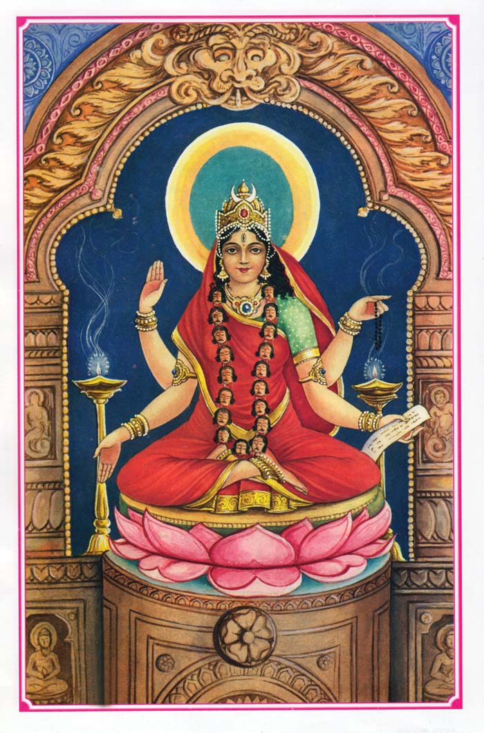 The fifth form of Mahavidya is Bhairavi. She has many names including Tripura Bhairavi, Sampath Praja Bhairavi, Kaulesh Bhairavi, Siddhida Bhairavi, Bhay Vidwamsi Bhairavi, Chaitanya Bhairavi, Kameshwari Bhairavi, Nitya Bhairavi and Rudra Bhairavi. Her body is the color of the rising sun. She wears a pearl necklace around her neck, has red breasts and has four hands in which She holds a japa mala, pustak, and displays the mudras of blessing and freedom from fear. She has three eyes that are red in color and wears a moon on Her forehead. Bhairavi is the form of Kali that killed Chanda and Munda. She is free from all fear and frees us from all fear. |