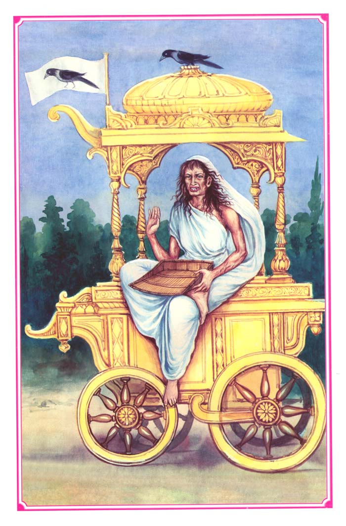 The seventh Mahavidya is Dhumavati. Here is the story of Her origin. One day Mahadev was sitting in Kailash and Parvati was on his lap. She told Shiva that She was very hungry and requested Him to get Her some food. Shiva asked Her to wait awhile and so saying went back into meditation. Parvati once again asked Shiva, “Hey Father of the Universe, please give me some food, I cannot wait any longer”. When Shiva asked Her to wait a second time, Parvati was so hungry that She became aggressive. The third time this happened, Parvati could bear no more and she ate Shiva to appease Her hunger. Immediately smoke started to come from within Her body. Shiva, who was inside her body, had opened His third eye and He said to Parvati, “Without me, there is no Purusha in the universe, only Prakriti, as only You exist.” For this reason, this is the widow form of the Goddess known as Dhumavati. Dhuma means smoke, and She is depicted without any ornaments and in widow apparel. Dhumavati demonstrates renunciation and removes all frustration and agitation, and is free from disrepute. |