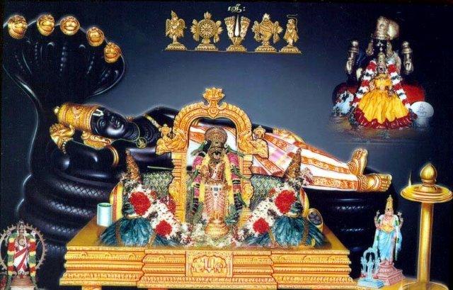 The deity here resembles as the Lord is in Srivaikundam. Once Lord Bramha meditated on Lord Vishnu and got the Sriranga Vimanam, the pose of Lord Vishnu as He is in Srivaikundam. Lord Bramha was doing His Creation job only after worshipping the Sriranga Vimanam. Lord Surya’s grand-son King Ikshavagu worshiped Lord Bramha and brought the Sriranga Vimanam to Earth and placed in Ayodhya. The Surya Dynasty from King Ikshavagu to Lord Rama worshipped the Sriranga Vimanam. Lord Rama after Pattabishekam gave the Sriranga Vimanam to King Vibeeshana of Eezha (Lanka) Dynasty. While King Vibeeshana taking the Sriranga Vimanam to SriLanka, placed on the banks of River Cauvery & Kollidam. After some time when King Vibeeshana tried to unearth it , he couldn’t as Lord Vishnu has already given a boon to River Cauvery that Lord will come to Earth and wear her as a garland. Lord Vishnu appeared before him and told that Lord Ranganathar will be lying here and will be seeing the Sri Lanka from here. The Sriranga Vimanam was placed on the banks of Cauvery near Trichy and the ruler of Chola Dynasty at that time was King Dharmavarma. He was very happy and immediately built a small temple there for Lord Ranganathar and worshipped daily. When there was a flood in the Cauvery the temple went inside the Earth. From the heredity of King Dharmavarma came a King called Killivallavan, he while resting under a tree, a parrot advised him that the Lord Ranganathar is under this tree. He immediately unearthed the Sriranga Vimanam and renovated it and named the place as Sri Rangam. This temple is one and foremost of the Nava Rathnam Temple representing Ranga Rathnam. |