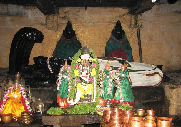 This ancient temple is believed to be more than 2000 years old. Lord Vishnu is present in Bujanga Sayana posture here. The holy water or theertham at this temple are Gajendra Pushkarni and Kapila theertham. There are separate shrines for Yoga Narasimhar, Sudharshana, Azhwars and Garudan. The moolavar, Gajendra Varadar is in bujanga sayana under the Kadhanakkruthi Vimanam. His Consort at this temple is Ramamani Thayar. She is also known as Shenbagavalli or Pottramarayal. She has a separate shrine to the right of the Lord�s shrine. Kapisthalam is one of the Pancha Krishna Kshethrams. The other four are, Thirukkannamangai, Thirukannapuram, Thirukovilur and Thirukannangudi. Gajendra Varadhar Temple, Kapisthalam Dwajasthambam The legend of Gajendra Moksham from the Bhagawad Gita, is associated with this temple. Gajendra Moksham is believed to have happened at Kapisthalam. A Pandya King by name Indradyumnan was a staunch devotee of Lord Vishnu. Once, the Great Sage Agastya and his disciples came to visit this King. The King was in his prayers and hence could not attend to his guests immediately. Agastya felt insulted and was very angry. He cursed the King to become an elephant. After Indrayumnan apologized, Sage Agastya also pronounced that he will be absolved of his sins by the Divine Grace of Mahavishnu. Accordingly, the King was born as an elephant. Around the same time, Huhu, a Gandharva, playfully pulled the leg of Sage Devala while he was bathing. The angry Sage cursed him to be born as a crocodile. The Gandharva apologized and as in the case with Indrayumna, the Sage said that he would attain Moksha by Lord Vishnu.Indrayumnan who was reborn as the elephant was very strong and ruled over the forest. As in his previous birth, he continued to be a staunch devotee of Lord Vishnu. He used to go to a pond daily to pluck lotus and offer to the Lord. On the eventful day, Gajendra as usual went into the pond to fetch the flowers to offer to Mahavishnu. A short while after he got into the pond, Gajendra felt his leg being dragged from under the water. Gajendra tried to free himself but in vain. To his horror he found that a really huge crocodile had caught hold of his leg and was pulling him under water. However much he tried, Gajendra could not free himself from the vice-like grip of the crocodile. After a prolonged struggle and battle, Gajendra realized that it will be a futile effort. He then prayed to Lord Vishnu and surrendered to the Lord to save him. Lord Vishnu used His discus to cut off the head of the crocodile. Immediately, the crocodile turned into Huhu and Gajendra also attained Moksham. It is believed that those who fully surrender to the Lord just like Gajendra had done will be saved and protected by Him. He is known as Papa Vimochakan as He absolves His devotees of all their Sins. The festival commemorating Gajendra Moksham is celebrated during the Tamil month of Panguni. Vaikunta Ekadesi, Rama Navami and Akshaya Tritiya are other festivals that are celebrated on a grand scale at this temple. Mahavishnu is also believed to have given darshan to Gajendra as Kannan. Hence He is also known as Aatrankarai Kidakkum Kannan. Hanuman the monkey God is also believed to have worshiped the Lord here and was given darshan by the Lord in the form of Rama. Kapi means monkey and hence the name Kapisthalam. This is one of the nine vaishnava navagraha sthalam around Kumbakonam and is the Parihara Sthalam for Rahu. |
