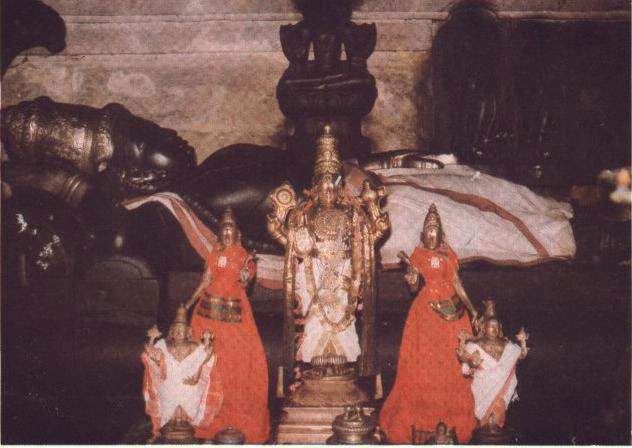 The Lord does the final ceremony for Jadaayu, the Eagle belongs to the pull family (One king of bird family) and after finishing the ceremony, he takes rest. So this shetram is called as "Pullam Kudi". Kudi means the place of staying in Tamil.Kiruthrajan, when doing tapas keeping Lord in his heart and mind, Valvil Raman arised in front of him in Bujangha Sayanam. Since, the Theertham which purified Kiruthrarajan, the theertham here is called "Kiruthra theertham". As he was held in the forest, when King Dasaratha was dead, he could not do the final funeral to his father. But, keeping Jadaayu in his father's place, he did the final funeral to him as what he could have done to his father, King Dasaratha.The final funeral of Jadaayu was done under Punnai tree. The main point to be noticed in this shetram, is only here, Sri Ramar gives his seva as Chakaravarthi (along with Sangu and Chakram). |
