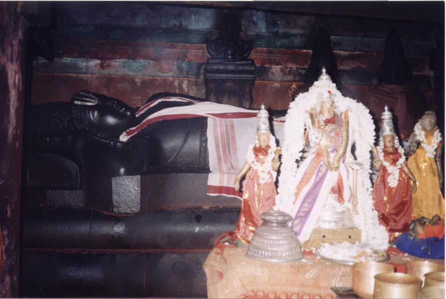 Kaamadhenu which is known to be a Divine cow is said to be good to give all sorts of wealth. During Kurma Avatharam taken by Lord Vishnu, all sorts of good things come out of it, which is used to the world. One of those things is Kaamadhenu, which is gifted to Indiran, the king of swargha Lokam. Pasu (Cow)=Aa + than + oor. "Aa" means cow. Since, the Lord gave Prathyaksham for Kaamadhenu, this sthalam is called as "Thiru Adhanoor". The lord gives seva along with Ranganayaki Thaayar in this sthalam in Kidantha thirukkolam and having Marakkaal (Which is used as a measuring tool) below his head and a writing instrument, Ezhuthaani and Palm leaf in his left head. Only in this divya desam, the body (Thirumeni) of thiru mangai alwar reside inside the Garbhagriham (Where the moolavar is situated). But om rest of the temples, alwars will be outside the Garbhagriham. |