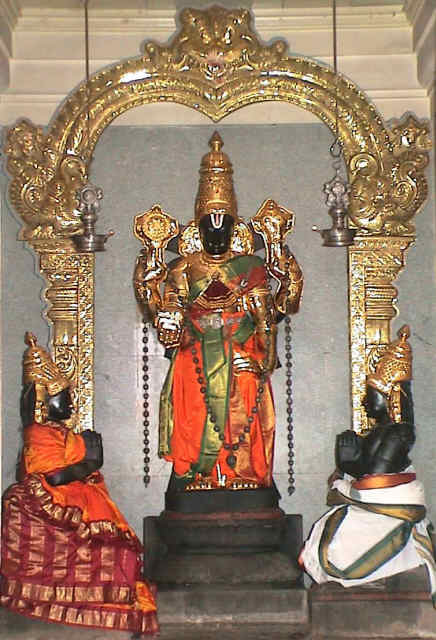 Lord Vishnu-Perumal came to Sage Markandeya on a Panguni (March-April) Tiruvonam star day seeking his daughter’s hand in marriage. The wedding took place on Aipasi (October-November) Tiruvonam Star day. Remembering this event, on Tiruvonam Star day each month, special pujas are performed with Aganda Deepa (big deepa) and Long deepa – Vaal deepa lighting. It is believed that Mother Mahalakshmi graces devotees from these lamps. This darshan is considered a lucky one by the devotees. On Aavani Tiruvonam star day, Perumal grants darshan – Udaya Garuda Sevai. Then He bathes in the Nattaru River praised as Dakshina Ganga. Special pujas are performed after this event. The practice of soothsaying before the lamps is followed even these days. The slogan uttered by Lord in His Gita Teaching “Maam Charanam Viraja” is written on His right hand pointing to His feet. This means “I take care of those surrendering to me”. Saint Thirumangai Azhwar had praised this Perumal as such. Perumal granted darshan to Azhwar in five forms – Tiruvinnagarapapan (in sanctum sanctorum), Ponnappan (procession deity), Maniappan and Ennappan in Prakara shrines and Muthappan. Of these, Muthappan shrine is not in existence. Discus and Conch are with the Lord in Maniappan shrine. Nivedhanas are prepared in this temple without salt. It is believed that taking salted food into the temple is a sin. As Sage Markandeya, ever 16 in age, worshipped in this temple, special homas as longevity and Mrutyanja homas are performed in the temple. Ahora Pushkarini Theertha is revered high. Devotees can bathe in this thertha both in day and night. Generally Mother Bhoomadevi is on the left side of Perumal. As Lord wedded her in this place, She has the right side here. Also, while offering his daughter to Perumal in marriage, Sage Markandeya took an undertaking from the Lord that He would not part with Her even for a moment. Accordingly, during all processions, Lord appears with Mother Bhoomadevi. |