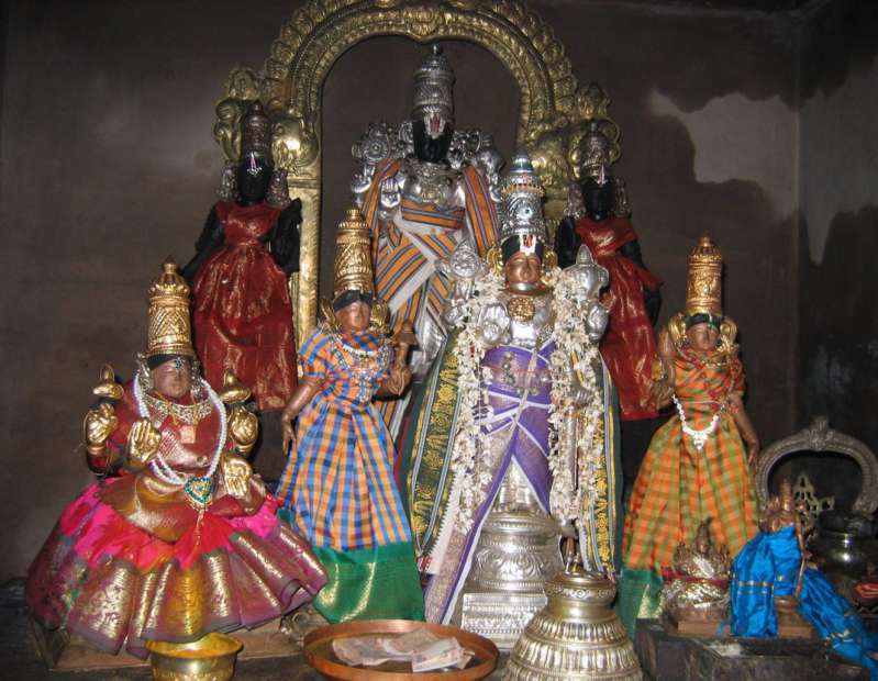 The legends of all the eleven temples of Thirunangur are closely associated with each other. As per legend, the Hindu god Shiva started dancing in fury at this place after the death of his consort Uma due to the yagna (sacrifice) of Daksha. Each time his lock of hair touched the ground; there were eleven other forms of Shiva who appeared. The celestial deities were worried that if the dance continues, it would result in decimation of entire creations. They prayed to Vishnu for help, who appeared at this place. On seeing Vishnu, Shiva's anger was reduced and he requested Vishnu to appear in eleven forms like he did. On his request, Vishnu appeared in eleven different forms at Thirunangur. Arimeya Vinnagaram literally translates to the place where Hari (another name of Vishnu) resides. The eleven places where Vishnu appeared are believed to be where the eleven temples in Thirunangur are located. Rama, the seventh avatar of Vishnu came to this place after killing Ravana. He made a golden idol of a cow and gifted to a Brahmin from the ashram of sage Dranethra, from where the place obtained its name. It is believed that Azhagiya Manavalar, the presiding deity at the Azhagiya Manavala Perumal Temple in Trichy came to this place at the request of Shiva. The Brahmin is believed to have built the temple with the gold he obtained and hence it is called Thiruchemponsey (chempon indicated gold in Tamil). Thirumangai Azhwar had seen Srirangam Ranganathar, Thirupathi Venkatesar and Kanchi Varadhar in this Perumal Himself as mentioned by the Azhwar in his various pasurams about this kshetram, so worshipping this Perumal is considered equivalent to worshipping all these three Perumals at this very same place. Once there lived a Brahmin Mukunda, elder son of Kashyapa. He chanted the Ashtakshara Mandiram continuously for 32,000 times here and gained abundant wealth from Perarulalan. As the Lord gives away love and wealth generously to His devotees along with Lord Shiva, He is called as Perarulalan, i.e., a person of generosity. To indicate the never ending generosity of Perarulalan, Lilly flower blooms even during night time (Thaayar has the name of Alli). This sthalam is called with other names like Hema Rangam, Nagapuri, and Nangai Nagaram. Sages Rudra and Dhrudanetra Muni had the gift of enjoying the darshan of Lord in this temple. |