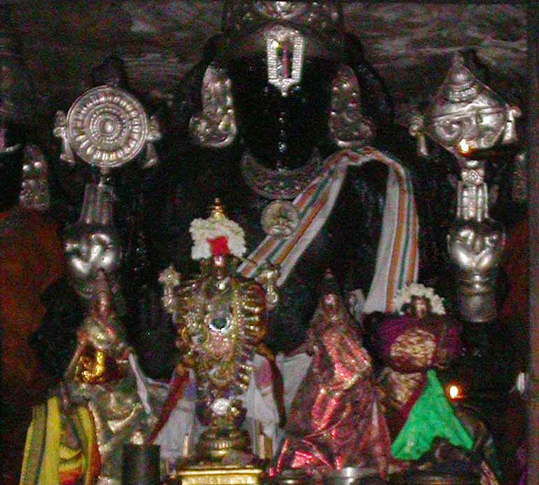 Thiruvali - Azhagiyasingar temple covers an area of about 0.5 acres (0.20 hectares). The temple in enclosed in a rectangular enclosure with surrounded by granite walls. The central houses the image of the presiding deity, Azhagiyasingar facing west. The image is made of granite is sported in sitting posture, with Lakshmi seated on his lap on the right side. This posture is unique as usually the image of Lakshmi on Narasimhar temples are sculpted on the left side. The festival deity is named Thiruvali Nagaralan and the image is also housed in the sanctum. A south facing shrine of Thirumangai Azhwar is located outside the temple walls, opposite to the Garuda Mandapam. It is believed that the image of Narasimhar in the temple is one among the five original images of Narasimha worshipped by Thirumangai Azhwar. The temple mast, the shrine of Garuda and a four pillared hall are located axial to the sanctum, outside the compound wall. The Vimana-tower above the Sanctum Sanctorum is known as Ashtakshara Vimana. Main Deity is called as Azhagiya Singar (Lakshmi Narasimhar) / Vayalali Manavalan and Mother is called as Pooranavalli / Amruthakadavalli. The presiding deity is also called by the names Lord Kalyana Ranganathan, as Lord was appeared in the form of a groom to Thirumangai azhwar. Theertham of the Temple is Ilaakshani Pushkarani. Sthala Vriksham is Bael Tree. The Utsavar is called as Thiruvaali Nagaraalan. The temple is a small one with a single prakaram. The other deities of the temple are sage Poornamaharishi, Azhwars, Saint Manavala Mamunigal, Thiruvaali Nagaraalan, Allathi Nikanchama Prajapathi etc. Thiru Nagari - Vedarajan temple covers an area of about 2 acres (0.81 hectares) and has a seven-tiered gopuram (gateway tower) rising to a height of 125 ft (38 m). This Temple has Sanctum, Ardhamandapam, Mahamandapam and 4 inner prakarams. It has three Gopurams with 7, 5 and 3 stages respectively. The temple in enclosed in a rectangular enclosure with huge granite walls. The sanctum is approached through a second gateway tower. There are a series of pillared structure around the basement of the first enclosure. The central shrine has an elevated structure (Maadakovil) and houses the image of the presiding deity, Vedarajan (Vayalali Manavalan) with Sridevi and Bhudevi. The image is made of granite is sported in sitting posture facing west. The festival deity is named Kalyana Ranganathar and the image is also housed in the sanctum. This is the only Divya Desam where one can see ‘Kalyana Ranganathar’ in a sitting posture. The vimana, the shrine over the sanctum is Ashtanga in architecture, which has eight parts. The outer parts of the vimana has stucco images of sages, Dasavatara, Lakshmi Narasimha, Lakshmi Narayana and other Avatars of Vishnu. Two of the Narasimhar images, Yoga Narasimha and Hiranya Narasimha, worshipped by Thirumangai Azhwar are located in this temple, one behind the main shrine and the other in one of the prakarams. It is believed that these two images of Narasimhar in the temple are among the five original images of Narasimha worshipped by Thirumangai Azhwar. Thirumangai Azhwar is seen with the vel he won from Thirugnana Sambandhar in a separate shrine with a separate Dwajasthambam (apart from the main Dwajasthambam opposite the Perumal shrine). Thirumangai Azhwar is depicted as a hunter, which he originally was; adjacent to him is a small image of Vishnu (Sindanaikkiniyaan, which he had held in worship during his lifetime). The shrine of Amruthavalli is located in the basement, in the diagonal corner of the first enclosure. Theertham of this Temple is Ilaakshani Pushkarini. The other deities of the temple are Andal, Azhwars, Udayavar, Kannan, Nadha Munigal, Desikar, Poornamaharishi, Aalinganapureeswarar Manavala Mamunigal, Thiruvaali Nagaraalan, and Allathi Nikanchama Prajapathi. |