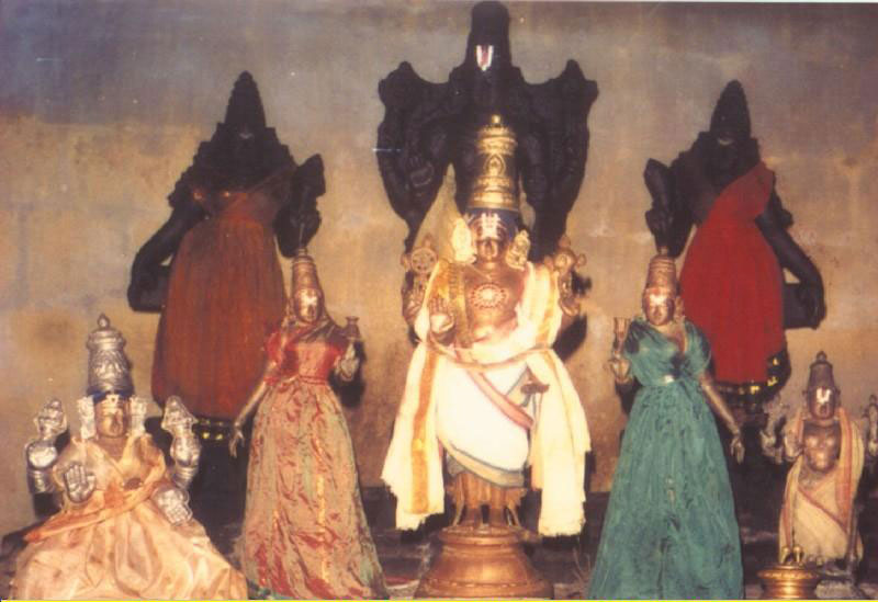 The Tirumangaialwar Mangalasasana utsavam in the month of Thai (after the new moon night) witnesses Garudasevai - a spectacular event in which festival images of Perumaal from the 11 (Tirunaangur) Divya Desam shrines in the area are brought on Garuda mounts to Tirunangur. An image of Tirumangai Alwar is brought to Tirunaangur on a Hamsa Vahanam (from Tirunagari) and the his paasurams (verses) dedicated to each of these 11 Divya Desams are recited. The image of Tirumangaialwar circumambulates each of these deities, and at the conclusion of the festival, the images are returned to their temples. Prior to this, the image of Tirumangaialwar and his consort are taken in a palanquin to each of the 11 Tirunangur Divya Desams, (trampling) through the paddy fields in the area, and the paasurams dedicated to each of the 11 Divya Desams are chanted in the respective shrines. The Ekadasa Garuda Sevai is the most important festivals in this area, and it draws thousands of visitors. |