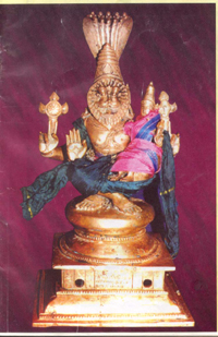 Nrusimha (in Sanskrit), popularly called by devotees as "Narasimha", denotes the divine form of half man and half lion. The Asura King Hiranyakashibu on the advice of his guru Shukracharya, undertook severe penance on Lord Bramha and when the God appeared before him, he requested the following boons in the hope that he will not die. 1) No human or animal can kill him. 2) Death should not occur in his palace and outside. and 3) Death should not occur during day time or night. When he was granted with the boon, he thought he was immortal and tortured saints not realizing that no human being is immortal. His near immortality made him to think himself as God and he forced his subjects to worship him as their God. Those who refused to accept him as their God were either killed or driven out of his country. Meanwhile, his wife was pregnant and she used to hear the Bhagavatha from Naradha Maharishi. |