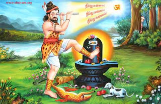 Nagan was the king of hunters at Uduppur in Pottapi Nadu. His wife was Tattai. They were great devotees of Lord Subramanya. By His grace, they had a child, after a long time. It was very heavy: so, they named him Tinnanar. Tinnanar was Arjuna in the previous birth, according to Tiru Kalahasthi Puranam. When he went to worship Siva, to get Pasupatha Astra, and when the Lord came to him as a hunter, Arjuna did not recognise Him. So, he had to be born as a hunter again and adore the Lord, before attaining Final Liberation. Tinnanar was educated according to the hunters’ customs. He became a good archer. Even when he was young, his father retired, and crowned him king. Though he was a hunter and carried on hunting as his Dharma, Tinnanar was full of love and would not kill young ones, females, diseased animals, etc. Spiritually, he had already killed the animals within himself, viz., lust, anger, greed, vanity, etc. One day, Tinnanar went out hunting. A pig escaped from its net and was running away. Tinnanar pursued it accompanied by two others, Nanan and Kadan. The pig was tired and stood near a tree. It was quickly killed by Tinnanar. They were tired, too, and thirsty. They proceeded towards the Ponmukali. Tinnanar wanted to climb the nearby mountain. Nanan, too, volunteered to follow him, saying that on that, the Kalahasthi hill, there was Lord Kudumithevar (God with a Tuft). Kadan was busy cooking the pork. Even when he began to climb the hill, there was a definite change coming over Tinnanar, owing to past Samskaras. He felt that a great burden was being lifted off his shoulders. He was losing body-consciousness. As he saw the Lord there, he felt supreme love surging in his heart. He embraced the Lingam and kissed It. He began to shed tears of joy. He felt that the Lord was lonely there, and that he should thenceforth remain with Him. Again, he thought that the Lord might be hungry. Though he was reluctant to leave the Lord alone, he quickly came down the hill to fetch some food for the Lord. He took the best pieces of the pork, tasted them and ear-marked the very best for Him. In the mean time, he gathered from Nanan that the Lord was worshipped daily with water, flowers, etc, before the food was offered to Him. So, he began to collect the other articles of worship. He filled his own mouth with water from the river. Flowers, he gathered and wore them on his head! He took the pork, bow and arrow and went up the hill again, alone this time. At the temple, Tinnanar poured from his mouth, the water that he had brought for His worship. That was his ‘Abhishekam’. Then he decorated the Lingam with the flowers he had brought on his own head. This was his ‘Archana’. He then placed the pork before the Lord. He went out and stood guard for Him, at the entrance, lest some wild animals should hurt Him. In the morning again he went out to hunt and bring fresh food for the Lord. In the mean time, Nanan and Kadan worried about the change that had come over Tinnanar (which they thought to be madness). They went and reported the matter to Tinnanar’s parents. They came and tried, in vain, to take him back. They, too, went away. When Tinnanar left the temple in the morning to get food for the Lord, Sivagochariar, the temple priest, came there for the usual orthodox worship. He was horrified at the desecration that some unknown person had done in the temple. He was well versed in the Agamas (rituals of Siva-worship). He performed the necessary purificatory rites and took bath again and began his formal worship. He brought water in a holy pot, with a bandage around his own mouth, lest the breath of his mouth should pollute it. He brought fresh flowers in a holy basket. He brought fruits and sweets, newly made and unpolluted by anyone tasting it, before the Lord for being offered to Him. He went home after the worship. Tinnanar returned with fresh meat. He removed the priest’s decorations, and did the worship in his own way, and then as usual, stood guard at the entrance. This went on for five days. The priest was greatly upset about the desecration of the holy place. He appealed to the Lord to stop it. Lord Siva wanted to show to Sivagochariar the nature of Tinnanar’s supreme devotion. He commanded him in a dream, to hide himself behind the Lingam, when Tinnanar went to the temple the next day, and watch what took place. On the sixth day, Tinnanar went out as usual for getting the Lord’s food. While returning, he saw many ill omens, which made him feel that something had happened to the Lord: he was so unconscious of himself, that he did not think that something could happen to him. He ran towards the Lord. He was grieved to see blood issuing from the Lord’s right eye. The articles he had brought for the worship dropped from his hand. He wept bitterly. He could not find who had done this to the Lord. He treated the eye with herbs he knew of. Still the bleeding did not stop. A simple idea occurred to him: ‘flesh for flesh’. At once, with his own arrow, he took out his own right eye, and fixed it over the right eye of the Lord. The bleeding stopped. He was very happy. When he was dancing in ecstasy, he noticed that the Lord’s left eye had begun to bleed. But, he had already found out the remedy. There was only one problem: how to locate the eye of the Lord, when his own eye had been pulled out. So, Tinnanar planted his foot at the place where the Lord’s left eye was on the Lingam, and began to pull his left eye out, with his arrow. At once, Lord Siva caught hold of his hand and said: ‘My dear child, Kannappa! Stop plucking your eye.’ The Lord repeated the word Kannappa thrice. Kannappar was thrice blessed. Tinnanar became Kannappar, because he gave his own eye to the Lord. Lord Siva took him with both Hands, and kept him on His right side. Kannappar regained his vision and lived as god himself. Sivagochariar understood the true nature of devotion. This story has an esoteric mea