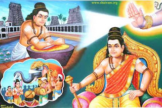 To adore Lord Siva with sandalwood paste, smearing it all over the Lingam is regarded as a great form of His worship. This kind of worship was done by Murthi Nayanar. He was born in Madurai in Pandya kingdom. He was a Vaisya by caste. He was a great devotee of Lord Siva. Daily he used to offer sandalwood paste to the Lord. At that time, the city was invaded by a Karnataka king. In the battle the Pandya king was defeated. The Karnataka ruler became the Pandya king. He was a follower of Jainism. He wanted to exterminate Saivism and to spread his religion. He began to persecute Saivas. ‘Murthi Nayanar also had to bear a lot of sufferings. But, he was undaunted. He continued his worship of the Lord, with sandalwood. The king, with a view to convert Murthi Nayanar forcibly to Jainism, made it impossible for anyone in Madura to obtain sandalwood. This greatly upset the Nayanar. He prayed to the Lord: ‘Oh Ocean of Mercy, this country is ruled by a tyrant and he is bent upon exterminating Your devotees. When will we be fortunate enough to get a king who will be devoted to You?’ He knew that the people would follow the king, out of fear and in an effort to win his favour. He, therefore, wanted a Saivite king! He searched throughout the day for a little sandalwood to offer his worship. He could not get any. With a broken heart, he went to the temple: and he had a wonderful idea. He began to rub his own elbow (in the place of sandalwood!). The hand was bleeding profusely. Lord Siva was highly pleased with his devotion. A heavenly voice said: ‘Oh noble soul, I am immensely pleased with your devotion. Kindly stop rubbing your elbow. All your grievances will be redressed. Kindly take up the reins of the kingdom. After ruling the country justly and wisely for a long time, you will come to My Abode.’ Nayanar was amazed to hear this and to see that his elbow regained its original shape. Murthi Nayanar did not aspire for kingship, but it was the Lord’s will. That night the cruel king died. The next day, the Ministers sent the palace elephant to choose their king, in accordance with an ancient custom. The elephant proceeded towards the temple. Murthi Nayanar had come there for his worship. The elephant bowed to him and placed him on his back and returned to the palace. The Ministers begged of Nayanar to become their king. Nayanar stipulated this condition: ‘If I become king, I will not have any luxury bath, but will bathe only with the sacred ashes. My jewel will be only Rudraksham and my crown will only be matted locks. I shall strive to let the love of Lord Siva be enthroned in the hearts of all.’ The Ministers accepted these conditions with great joy and satisfaction. Nayanar ruled the country justly and wisely for a long time, and eventually attained Siva’s Abode |