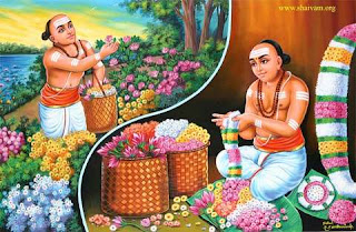 To do Archana with flowers mentioned in Siva Agamas, to offer flower garlands to the Lord, and to repeat the Panchakshara Mantra is the ideal form of worship. Panchakshara Mantra is considered a very great Mantra because it occurs in the centre of the Sri Rudradhyayi, which occurs in the middle of the middle Khanda of the Yajur Veda. He who does Japa of this Mantra is at once relieved from the disease of birth and death. Muruga Nayanar excelled in this worship. He was born in Tirupukalur, made famous by many other Nayanars also. Daily he would wake up well before sunrise, take bath, wear the sacred ash on his forehead, do his Nitya Karmas, and go to the garden with a basket. Repeating the Panchakshara he would collect flowers, and as mentioned in the Siva Agamas, make colourful garlands and offer to the Lord. One day the great Jnana Sambandar came to his place. Muruga Nayanar invited him and worshipped him and won his favour. Sambandar took him as his dearest friend. Muruga Nayanar got the great good fortune of attending Sambandar’s wedding when he, the bride and all others (induding Muruga Nayanar) got merged in the Divine Effulgence of the Lord. Hence, the Kural says: ‘Rarest of all rare things is to win the great to one’s side by courting it.‘ Muruga Nayanar’s devotion won for him Sambandar’s friendship, and, through that, God-realisation. |