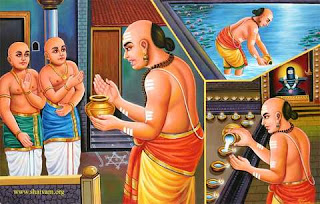 In the Chola kingdom there lived a Brahmin called Nami Nandi Adigal. Daily he used to go to Tiruvarur and worship Lord Siva, his sole refuge. One day, he felt an intense desire to light many lamps in the temple, which is an act highly extolled in the Siva Agamas. So, Nandi Adigal went to a near-by house and asked for ghee to light the lamps with. It was a Jain’s house: and the Jain said scornfully: ‘I have no ghee: if you are so eager, you may as well use water, instead.’ Nandi Adigal was filled with anguish to hear this. He went to the temple and prayed to the Lord. He heard a voice: ‘Don’t grieve. Bring water from the near-by tank and light the lamps with it.’ With great joy Nandi Adigal did so. Through the supreme grace of the Lord, all the lamps burned brightly! All the Jains were amazed to witness this miracle. Nandi Adigal did so on several days continuously. By that time, people’s faith in Jainism was lost through the miracles of Nandi Adigal of Tiruvarur. People embraced Saivism. The Chola king, hearing of Nandi Adigal’s greatness, appointed him as the head of the temple. He used to celebrate the Panguni Uttaram festival on a grand scale. The Lord would be taken to a place called Tirumanali where people of all castes would flock around and worship Him. On one such occasion, after finishing his duties, Nandi returned home. Feeling that the touch of people of all castes had polluted him, he did not enter the house and do the usual worship before he went to bed. He asked his wife to bring some water so that he could bathe and then enter the house. But, before the water came, he was overpowered by sleep. In a dream, Lord Siva said: ‘Oh Nandi! All those who are born in Tiruvarur are my Ganas (servants). They cannot be regarded as impure. You yourself will see this with your own eyes.’ Nandi Adigal woke up from sleep and told all this to his wife. He repented for his wrong notion. He at once performed the worship. In the morning he went to Tiruvarur. There he saw that all the people who were born there had the same form as Lord Siva Himself. Nandi Adigal prostrated before them all. They resumed their original forms: Nandi Adigal understood it was the Lila of the Lord. Then, Nandi Adigal settled down in Tiruvarur. He served the Lord and His Bhaktas so nicely that Appar praises him as ‘Anipon’ (pure gold). Ultimately he attained the glorious realm of the Lord. |