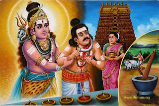 Kalia Nayanar was an oil monger of Tiruvotriyur. His adoration of the Lord, to Whom he was highly devoted, took the form of lighting the temple lamps daily. He was rich. But, in order to reveal his greatness the Lord made him poor. His family people also refused help. He began to work as a labourer to earn the oil. Even this became impossible. He wanted to sell his wife: but no one would buy. At last, in despair, he wanted to cut his own throat and use the blood instead of oil, to burn the lamps. In that attempt, Lord Siva caught hold of his hand and blessed him. What greatness, and what intensity of devotion is portrayed in this simple life! Self-forgetfulness is the key-note in devotion. Remembering God always, the devotee is so thoroughly absorbed in Him, that nothing but God and His worship matters to him. By all means His worship must go on: no obstacle shall stand in the way. The devoteeās heart and mind are always positive, never letting a negative thought enter them. He sees opportunities in difficulties and is never beaten by any obstacles which serve him as steps to God! |
