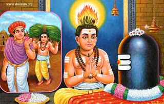Kanampulla Nayanar was a wealthy man in Irukkuvelur. He was a great Siva Bhakta. He wanted to utilise all his wealth in His service only. So, with unswerving devotion he would light the lamps in Siva shrines and sing His praise. Lord Siva wanted to reveal his devotion. He withdrew his wealth. He went over to Chidambaran. There also he continued his service, with the money got by selling his possessions. There was nothing left in the house. He had to cut grass, sell it and purchase ghee with the money and burn the lamps. Because he cut grass known as Kanampul, he was known as Kanampulla Nayanar. One day he could not sell the grass. He did not want to swerve from his duty, however. He went to the temple and made a wick out of the grass and burnt it. The quantity of grass was not enough. So, he brought his own head near the lamp, spread his hair on the lamp, and began burning it. At once Lord Siva appeared before him, and blessed him |