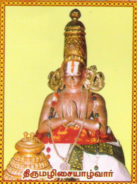 Thondai Naadu is one of the parts of Tamil Nadu where lots of well knowledged and religious persons were born. In this thondai Naadu, Thirumazhisai sthalam is found where lots of Munis and Yogis are found. Among them, one munivar by named Bargava muni was found who didn't have a baby. Because of this, he did tapas towards the Perumal and did a Yaagam by named "Sathram". As a result of the Yaagam, his wife gave birth to a baby which is said to be the Hamsam of Sudharsana Chakkaram of Sriman Narayanan. The baby was found in an incomplete manner (ie) it did not have hands, legs etc. On seeing the baby, both of his parents, Bargava muni and his wife were worried and felt bad for the baby and left it into a Perambhu (tree that belongs to Bamboo family) ditch. After they left, the Perumal along with Lakshmi Devi came towards the baby and blessed him with his sevai and as a result, the baby was completely filled up with all of his parts and his Gnana seemed to be enlightening. After this, the Perumal and Lakshmi Devi disappeared from that place. An Andhanan(stranger) by name "Thiruvaalan", was coming along that side and heard the baby crying. He didn't have any child, so he thought that the God has gifted him this and took the baby towards his house. |